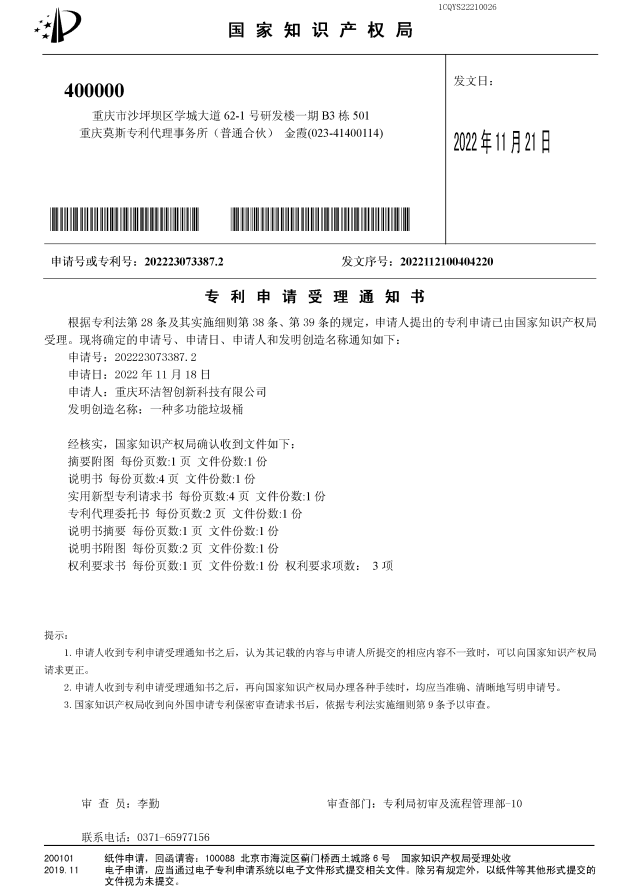 恭喜下發一種多功能垃圾桶實用新型專利證書